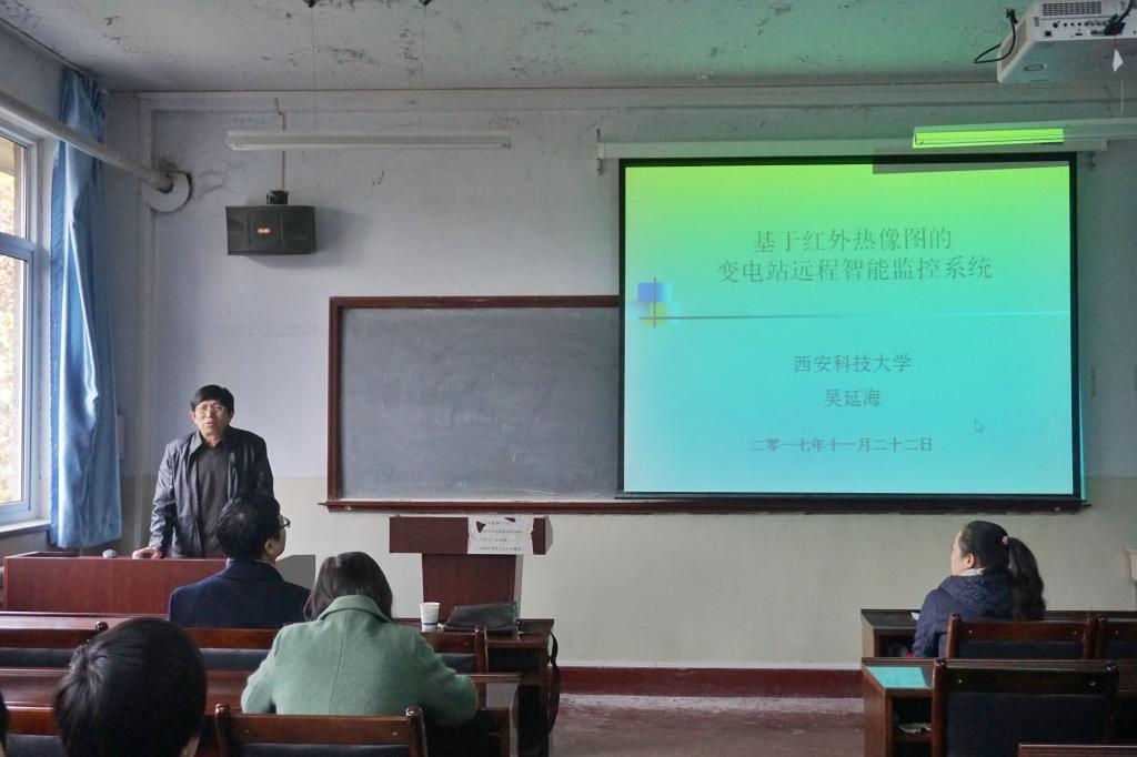 吴延海教授从红外热像图的变电站远程智能监控系统的研究背景、系统概述、主要技术指标、关键技术、创新点等五方面入手,向同学们系统和全面的讲解了红外热像图的变电站远程智能监控系统。报告会中,吴延海教授着重讲述了变电站红外图像压缩技术(M-JPEG)、变电站红外图像配准技术、变电站红外图像分割技术、变电站红外图像识别技术等四方面技术在红外热像图的变电站远程智能监控系统中的实例应用,向同学们展示了红外热像图的变电站远程智能监控系统未来的发展前景和发展方向。