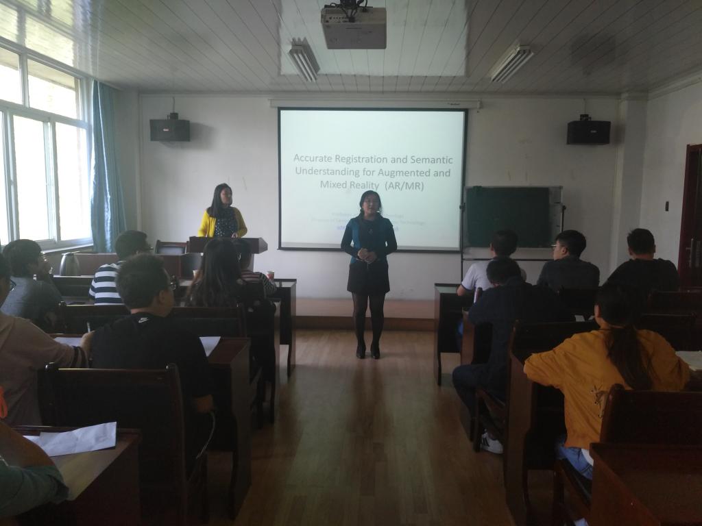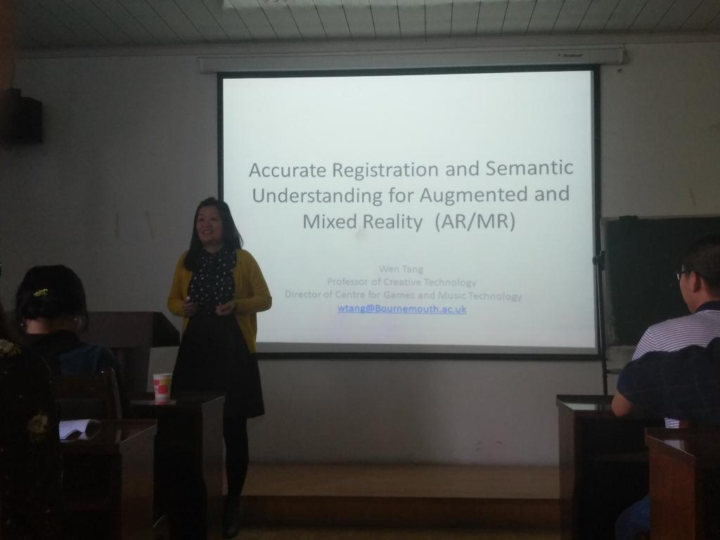 4月2日,在金花校区机电楼407多媒体教室,电信学院特邀陕西省百人计划特聘教授、博士生导师汤汶教授做了主题为“AR/MR环境下的高精度虚实定位跟踪与语言分析技术简介”的学术报告会。本次报告由米兰·(milan)中国副院长李云红教授主持,电信学院教师代表和2017级研究生共100余人参加了本次讲座。