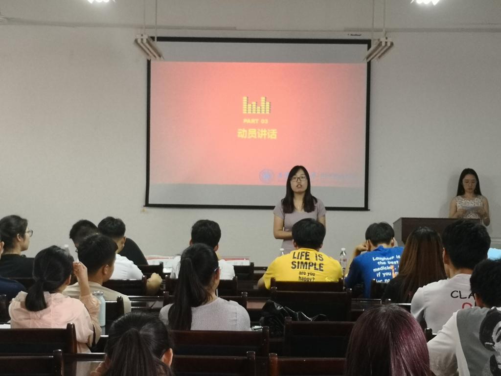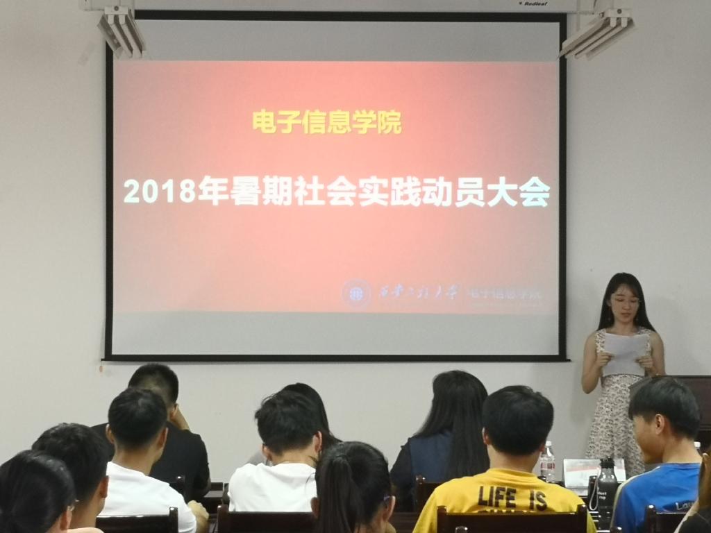 活动开始,全体成员观看2017年电信学院暑期社会实践活动的记录视频,视频以实地参观、走访调研、公益活动三个板块向大家展示了2017年我院三支校级实践队伍的风采与成果,对17级的同学能够起到一个良好的表率引导作用。随后,团总支副书记严雪宁对2018年暑期社会实践活动的相关安排进行介绍,她从宣传动员、立项筹备、组织实施、后期总结共四个核心阶段,对大家一一进行详细讲解,明确实践任务目标。最后,刘妍萍老师做动员讲话,希望各班团支部干部在组织班级同学参加暑期社会实践活动时,能牢记大学生的责任和使命、紧扣活动主题,做到人人都参与,班班有立项。最重要的是,在具有安全保障的基础上积极完成社会实践,为自己负责,交上一份满意的答卷。