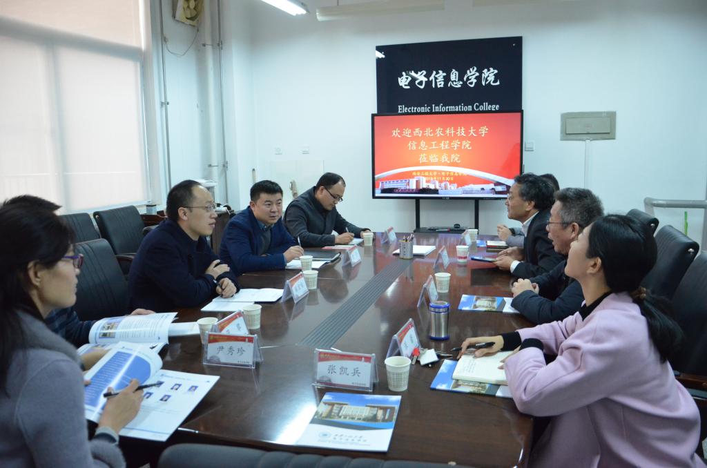 2018年11月30日上午,西北农林科技大学信息工程学院党委书记党青、副院长张宏鸣、党委副书记翟立、计算机控制系主任蒲攀、办公室主任尹秀珍一行5人赴我校米兰·(milan)中国走访、调研。电信学院院长赵广社、党委书记杨恩科、副院长张蕾、党委副书记刘许、院长助理张凯兵、信息与通信工程系主任朱磊、院办主任孙宁、教学秘书郭家桢参加了交流座谈会,会议由赵广社主持。