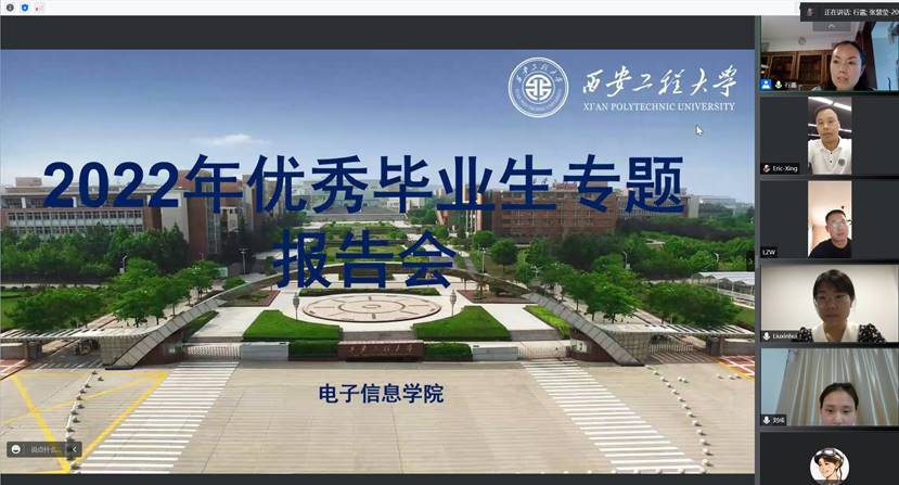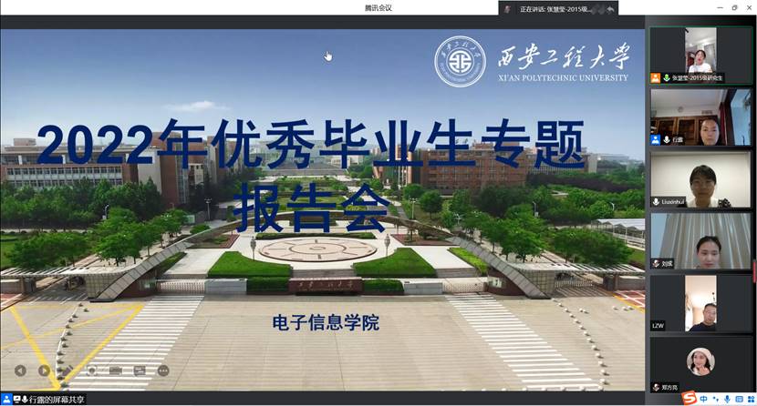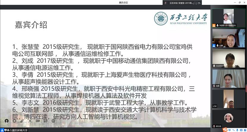 本次会议共邀请了6位毕业生代表,分别是:张慧莹,2015级研究生,现就职于国网陕西省电力有限公司宝鸡供电公司互联网部,从事通信运维检修工作。刘成,2017级研究生,现就职于中国移动通信集团陕西有限公司,从事通信电源运维工作。李倩,2015级研究生,现就职于上海爱声生物医疗科技有限公司,从事超声换能器设计工作。邢晓强,2015级研究生,就职于西安中科光电精密工程有限公司,三维视觉算法工程师,从事焊接机器人算法及软件开发。李志文,2016级研究生,现就职于武警工程大学,从事教学工作。刘新慧2015级研究生,现就读于西安交通大学计算机科学与技术学院,博四在读,研究方向为人工智能与计算机视觉。