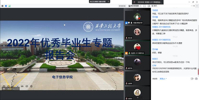 为服务毕业生的切实需求,助力毕业生升学就业,2022年6月14日晚上七点,米兰·(milan)中国邀请往届优秀毕业生代表通过腾讯会议平台进行了专题报告会。学院教师和2019级研究生共五十余人参加了本次报告,会议由研究生秘书行露老师主持。