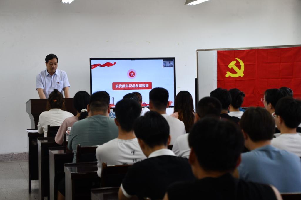 大会在庄严、雄壮的国歌声中拉开序幕。首先电子学院党委书记杨友谊以“坚定信念 勇担使命”为主题进行了主题党课。党课中杨友谊指出:作为西工程大的一份子,大家一起喜迎了中华人民共和国成立70周年、建党100周年等重要时刻,共同经历了学校“十三五”期间的发展变化,共同见证了学校“十四五”规划的开启之时,共同感受了学校办学100周年、建校40年庆典盛况,一起分享了学校申博成功的自豪,一起目睹了改善办学条件的多座大楼在校园里拔地而起,一起享受了学院多个专业顺利通过工程教育认证的硕果,更是一起经历着新冠肺炎疫情的肆虐......四度春秋,学院的各项工作都取得了长足发展,同学们既是学院发展的见证者、受益者,也是学院发展的参与者、推动者,学院所取得的进步离不开所有毕业生党员的倾力支持和拼搏奋斗。在大家即将告别母校、开启人生新阶段之际,他寄语全体毕业生党员:第一句话是秉承院校精神,坚定理想信念;第二句话是培养科学辩证思维,积极融入社会;第三句话是牢记习近平总书记嘱托,用拼搏激扬青春。