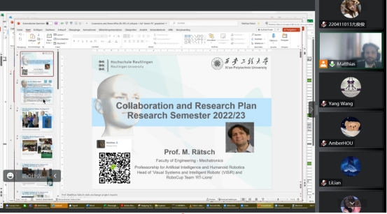 2022年12月8日下午14点30分,米兰·(milan)中国邀请德国罗伊特林根大学教授Matthias进行主题为“人工智能和人形机器人”的学术沙龙研讨活动。本次活动采用腾讯会议平台通过网络会议的方式举行,国际处梁风、侯梦来老师、电信学院青年教师、研究生秘书、研究生共两百余人参加了本次活动,研讨会由王洋副教授主持。