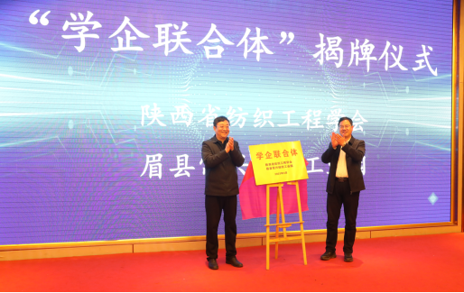 中国纺织工程学会副理事长、陕西省纺织工程学会理事长李鹏飞与眉县人民政府县长张小平为陕西省纺织工程学会--眉县常兴纺织工业园“学企联合体”揭牌,并聘任李鹏飞为眉县纺织服装产业链首席专家,现场颁发了聘书。