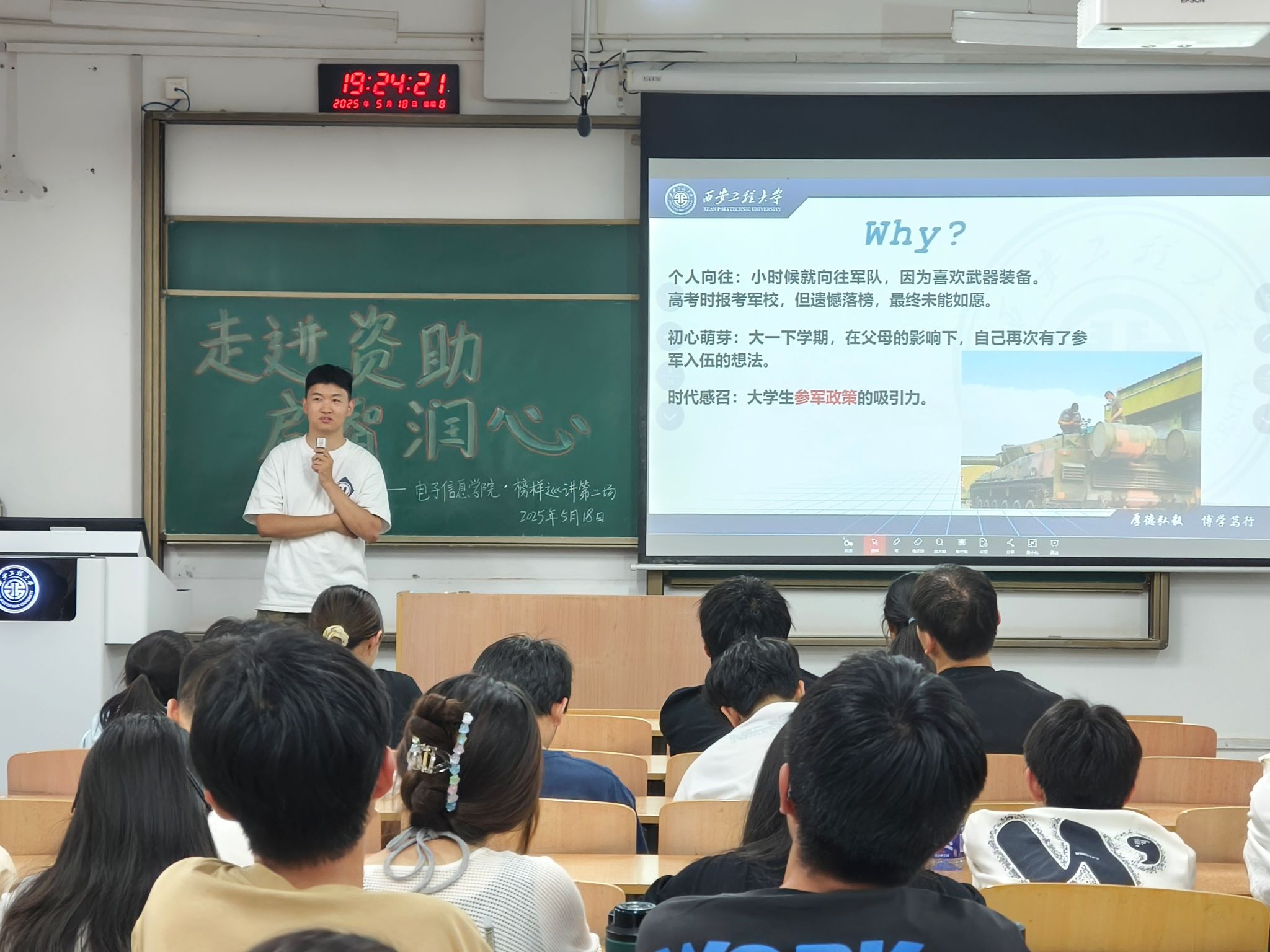 苗青青以《等风来,不如追风去》为题进行了近一个小时的分享交流,她重点结合自身考取国家电网的经历,为在场的同学们毫无保留地剖析面试中的关键要点,从面试过程中的应答策略,到如何展现个人优势与独特魅力,全方位为大家传授实战经验,并鼓励学弟学妹们不要害怕迷茫,要勇于在暂时的挫折中找准方向、汲取力量。李子鹏以《携笔从戎 淬炼成钢》为题,重点围绕“参军入伍的原因、参军入伍的经历、学习经验及未来规划”等内容,宣讲了服兵役学生国家教育资助政策,引导大家要爱国爱校,要坚守“勤勉求学”的本分,不断锤炼内功,为更好的谱写人生篇章蓄势赋能。分享结束后,同学们纷纷表示:“本次榜样巡讲犹如甘霖,不仅是经验的传递,更是希望的播撒,榜样精神在自己心里扎根,给予了自己前进的动力。”