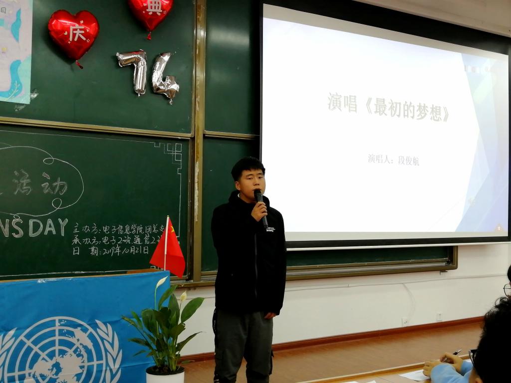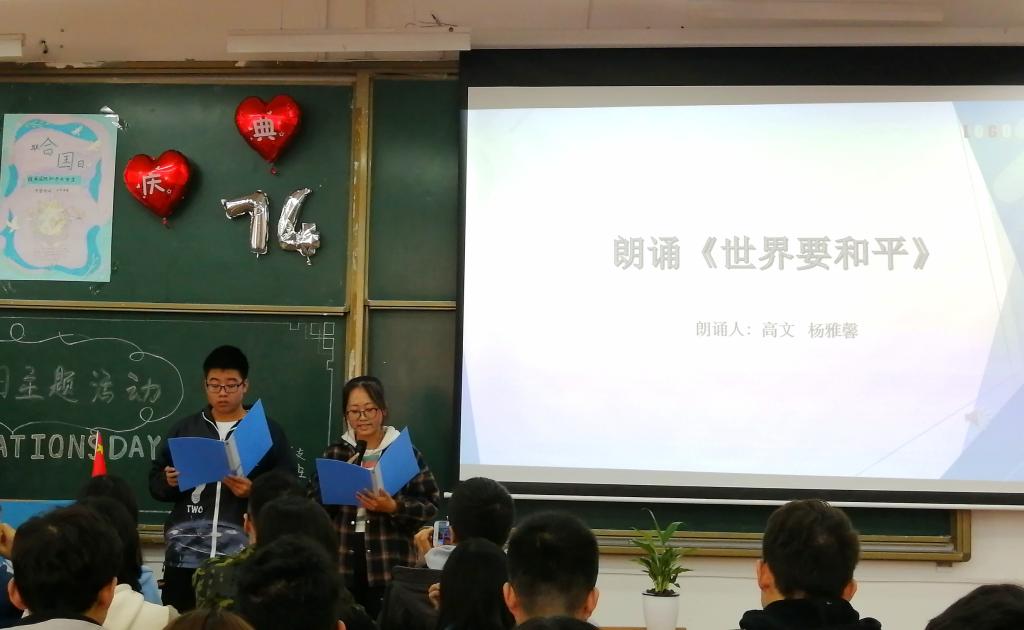 高文、杨雅馨、高子明同学以诗朗诵和主题演讲的形式,倡导大家更多的去关注联合国日,珍惜现在的和平生活。段俊航同学为大家演唱歌曲《最初的梦想》,同学们从他的歌声中找到共鸣,深刻体会到和平发展的重要意义。有奖问答环节的开展加深了同学们对联合国日设立意义及发展历程的印象,现场气氛达到了高潮。