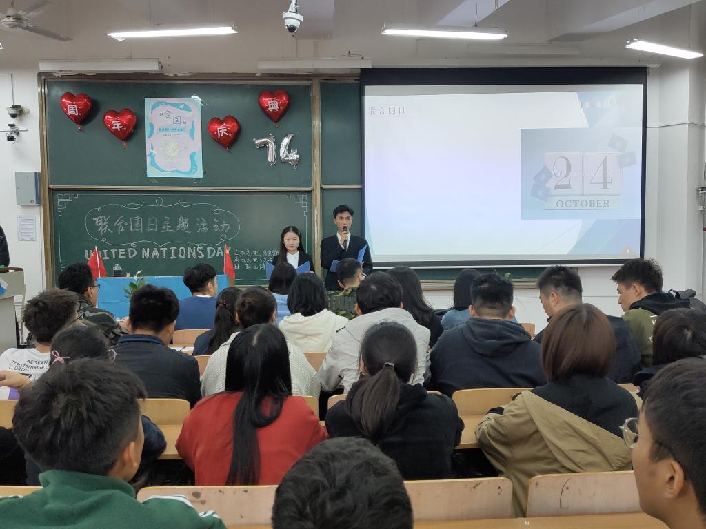 主持人通过开场视频让同学们了解到战争的危害,并向大家介绍了联合国日的内容及设立意义,着重讲解了我国与联合国关系的历史演变,使大家对该纪念日和中国的大国担当有了初步了解。