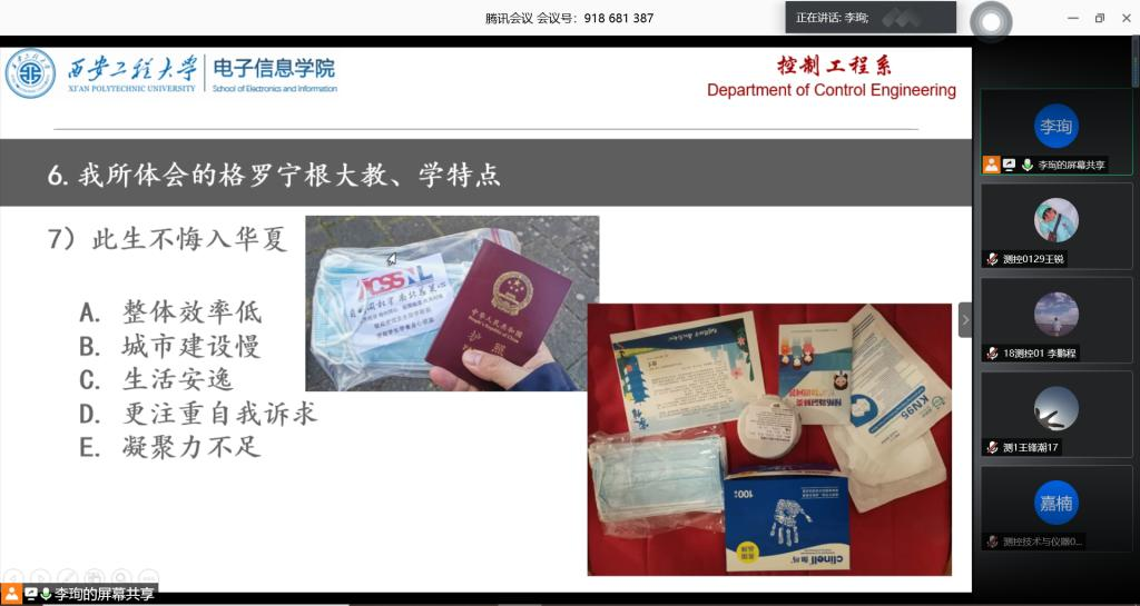 最后,李老师分享了目前在荷兰做访问学者的一些经历和感受,把国外的本科教学与学生的学习状态和国内进行对比,虽然教学模式有差异,但是我们的教育资源丝毫不比国外落后,告诫同学们要学习其良好的契约精神和自律的品质,这样才会获得丰硕的科研成果。李老师感慨“此生不悔入华夏”,尤其是疫情期间,祖国和学校的问候和支援让他格外感动,同学们都感同身受。