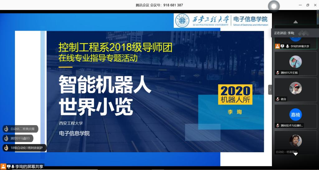 为更好地了解学科内涵,实现线上学习实现多元化的目的,充分发挥三全育人导师团的作用,2020年5月13日晚7点30分,导师团李珣老师通过腾讯会议做了专业指导讲座——智能机器人世界小览,本次讲座由控制系导师团李珣老师主讲,导师团秘书周梦宇老师为主持人,18级控制系导师团全体同学参加。