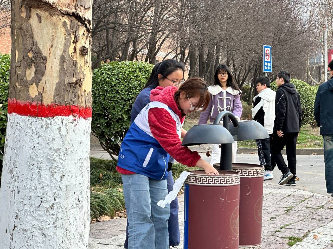 在本次活动中,各组志愿者们化身为环保小卫士,积极投身于环保行动中。他们分工明确,迅速投入到各自的任务中。一些志愿者们走进草丛,弯下腰,细心地捡起那些被风吹进去的塑料袋。他们不放过任何一个角落,确保草丛中的环境得到彻底地清理。另一些志愿者则在垃圾桶旁,耐心地捡拾周围垃圾,确保那些没有成功“回家”的易拉罐被归位。还有一些志愿者则负责检查环道两侧的树底,他们仔细检查每一个角落,确保没有落枝或杂物,以避免同学们在行走中磕碰受伤。