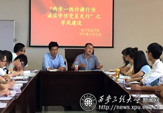 会议开始,张卫东向学生传达了学校关于“两学一做”学习重要指示和精神,谈了关于“两学一做”自己的看法。参会同学和老师就学风建设中的问题相互交流想法,对于学生的困惑老师们也给出了指导性的意见。赵立涛最后说,“两学一做”学习教育,“学”是基础,通过张卫东的讲和大家的讨论,充分的学习了“实事求是”的党的优良传统,进一步认识到诚实守信是学校培养高素质人才的必要条件。他希望各位学生党员强化身份意识、宗旨意识和大局意识,立足岗位发挥党员先锋模范作用。