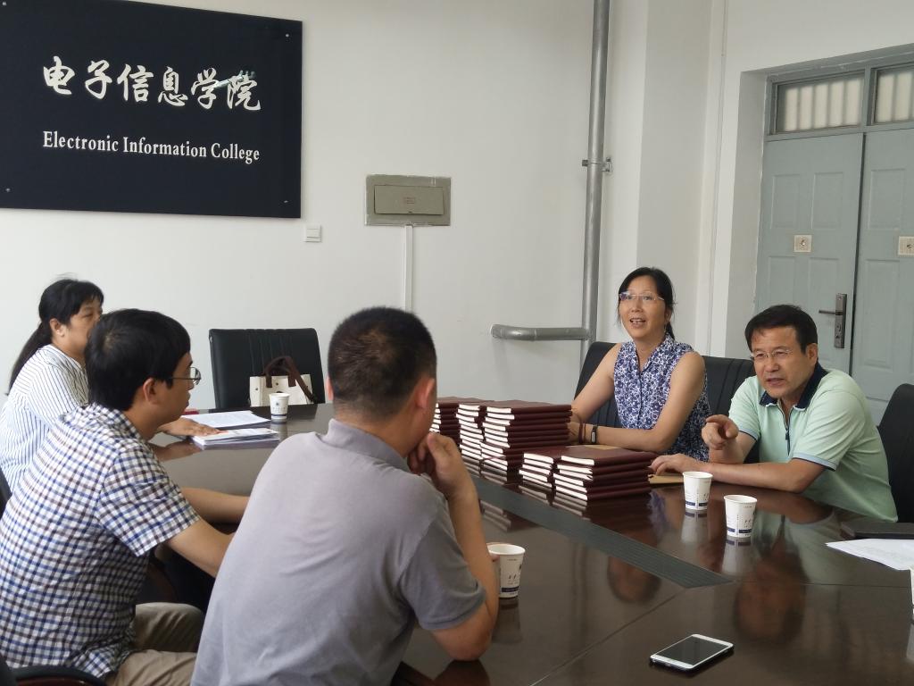 2017年6月22日下午,在电信楼414室,管理学院党委书记邢瑞芳、马克思主义学院党委书记宁立功、理学院党委书记谢明、计算机与科学学院党委副书记周波督促检查学院“两学一做”学习教育情况,学院党委书记孙晓宁、党委副书记杨建军及学院学工办主任朱宇军陪同检查。