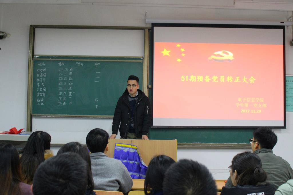 大会第一项:第51期预备党员转正仪式。首先,预备党员逐一发言,汇报了预备期间个人在思想态度、生活、学习、工作等方面的突出表现及收获。党员同志们表态,作为学生党员,一定要以身作则,时刻发挥党员先锋模范作用。随后,经过正式党员无记名投票表决,9名预备党员的通过票数超过与会党员人数的二分之一,予以按期转正。