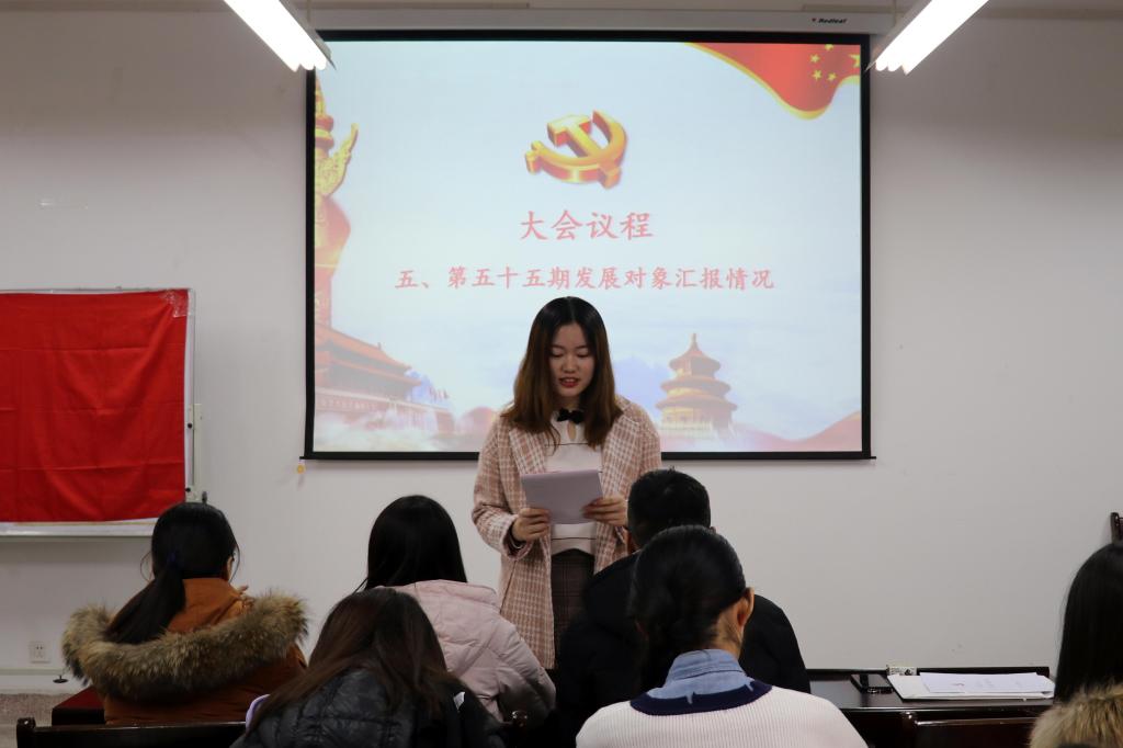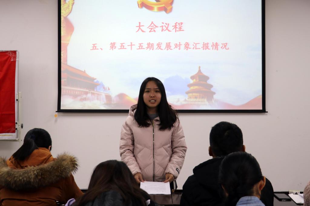 大会第二项,由四名发展对象汇报自己在一年考察期内学习、生活、工作、思想等方面的情况,同时表达了自己对加入中国共产党的态度和决心。