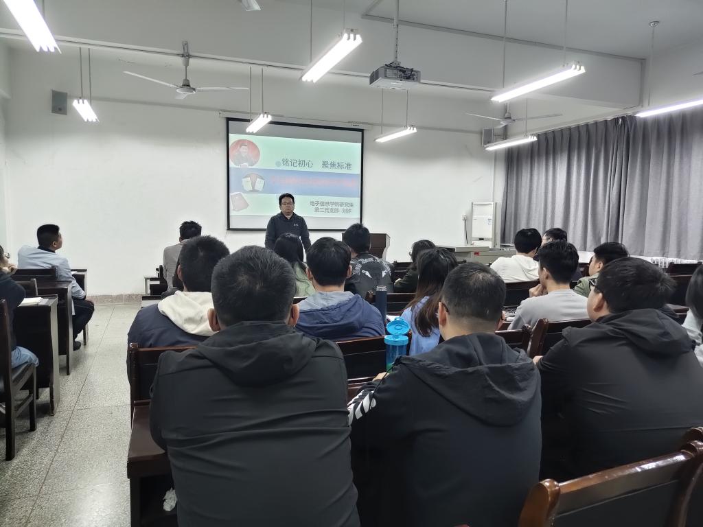 学习活动开始后全体党员及积极分子一起学习了《习近平关于“不忘初心、牢记使命”论述摘编》并进行心得分享。研究生第二党支部支部书记刘许给全体党员与积极分子上了关于“铭记初心、聚焦标准、争当新时代优秀共产党员”为主题的党课。他从党章的地位和作用、学习党章应把握的重点、如何做一名合格的共产党员、自觉守党的纪律这四个方面为全体人员进行讲解。他在党课中说到:“中国共产党人历来重视党章的地位和作用,国要有国法,党要有党规党纪。党章是最根本的党规党纪。没有党规党纪,国法就很难保障。作为学生党员,我们应当充分认识到党章的重要性,牢记党章党规,遵守党的纪律,在科研学习中要时时刻刻贯彻落实党的要求,做一名合格的研究生党员。”
