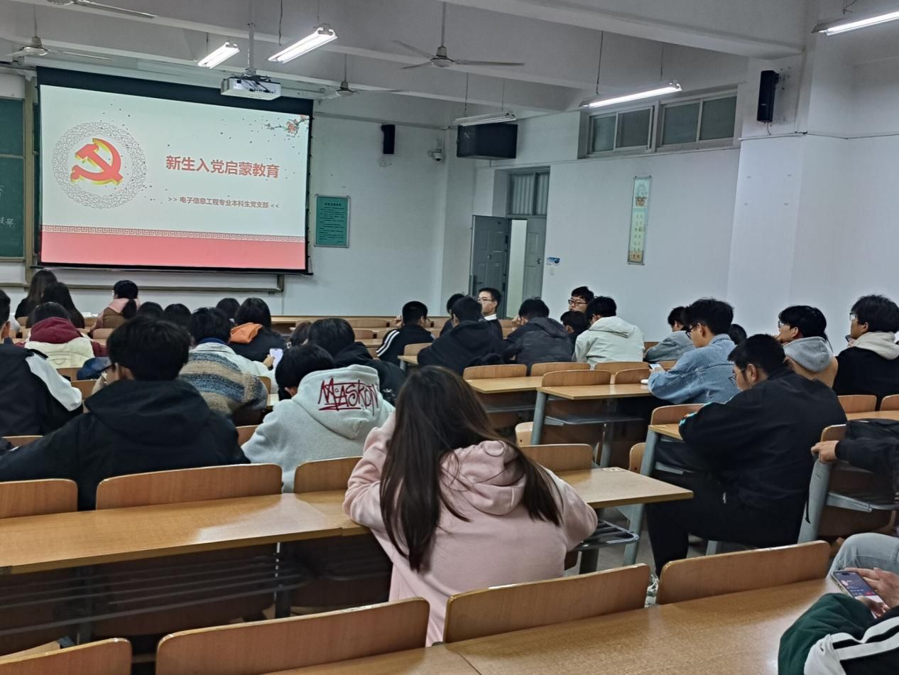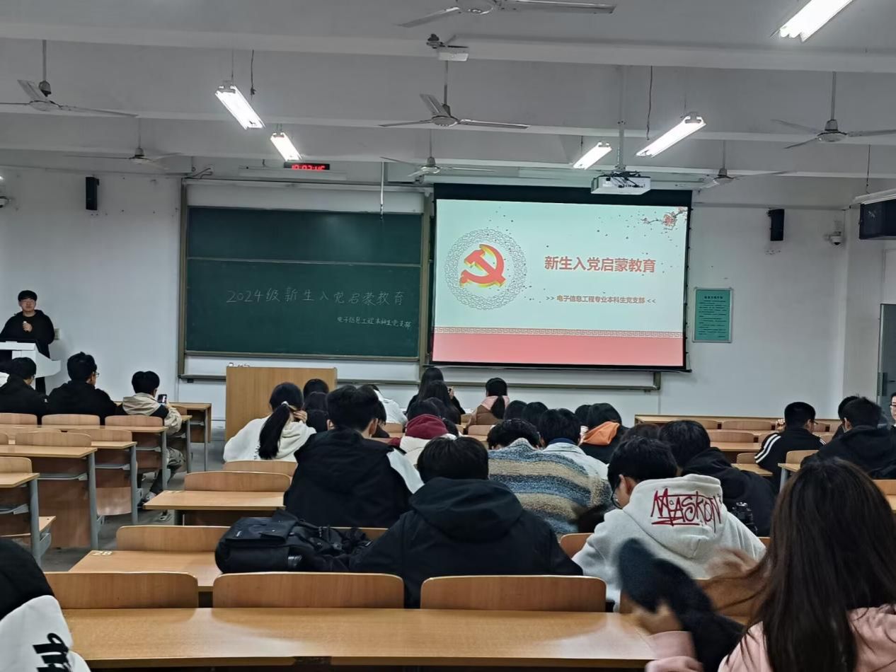 为切实做好2024级新生入党思想教育工作,引导新生知党、爱党、信党,帮助新生扣好思想的第一粒扣子。2024年10月21日18:00,电子信息工程专业本科生党支部于教学楼A-227面向2024级电子信息类3、4、5班开展“新生入党启蒙教育”主题活动。