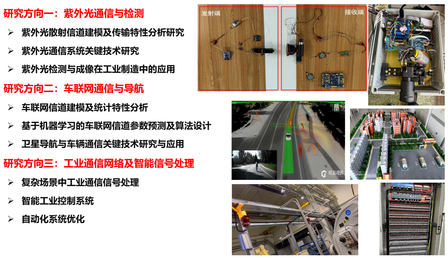 研究所紧扣无线通信技术发展趋势,致力于无线通信与智能网络、紫外光通信与检测、信息处理与智能控制系统、车联网通信与导航、工业通信网络及智能信号处理等方向的科技创新研究,聚焦无线紫外光通信特色研究方向,研制成功无线紫外激光通信系统和紫外光成像仪,助力隐蔽通信和紫外光成像检测技术进步。