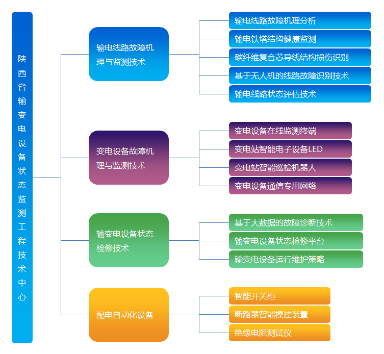 陕西省输变电设备状态监测工程技术研究中心分为输电线路状态监测技术研究室、变电设备状态监测研究室、输变电状态评价中心、电磁兼容技术与新型传感器研究室。开发的主要内容体现在智能电网输变电在线监测技术,将涵盖了变电站和线路运行的主要方面,主要研究方向: