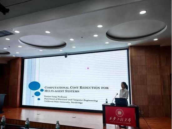 随后,耿晓军教授带来她的报告。报告包括两个方面的主题,第一个主题是讨论减少多智能体系统内的交互,研究方法为代数图论,算法将多智能体系统公式化为有向图。开发了一种简单的去中心化算法,通过建立一个理论框架来减少智能体之间的信息交互,从而放松对智能体可操作性的限制,降低计算成本。第二个主题是集中式电动汽车充电管理,提出了最小化计算复杂性的集中式充电方案,将调度问题公式化为优化问题,并设计了后退时域优化方法,实现对负载动态变化的实时适应,这两点在算法优化以及电力调度方面具有重要的意义。