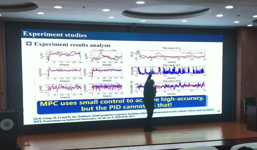 随后,李慧平教授带来了他的报告。李慧平教授首先介绍了海洋航行器的相关背景,海洋航行器是海洋作业的重要工具,在军事和民用领域具有重要的应用前景。接着,李慧平教授针对无人海洋航行器在复杂环境中能耗、控制性能、安全性等方面的迫切需求,引出了先进的模型预测控制技术。主要介绍了基于模型预测控制框架的海洋航行器经济规划和优化控制方法,重点介绍了欠驱动海洋航行器的优化运动控制、海洋航行器的经济预测规划等内容,并展现相关理论、设计过程中的主要问题和实验结果。李慧平教授的报告给同学们提供了许多新的研究思路和方法。