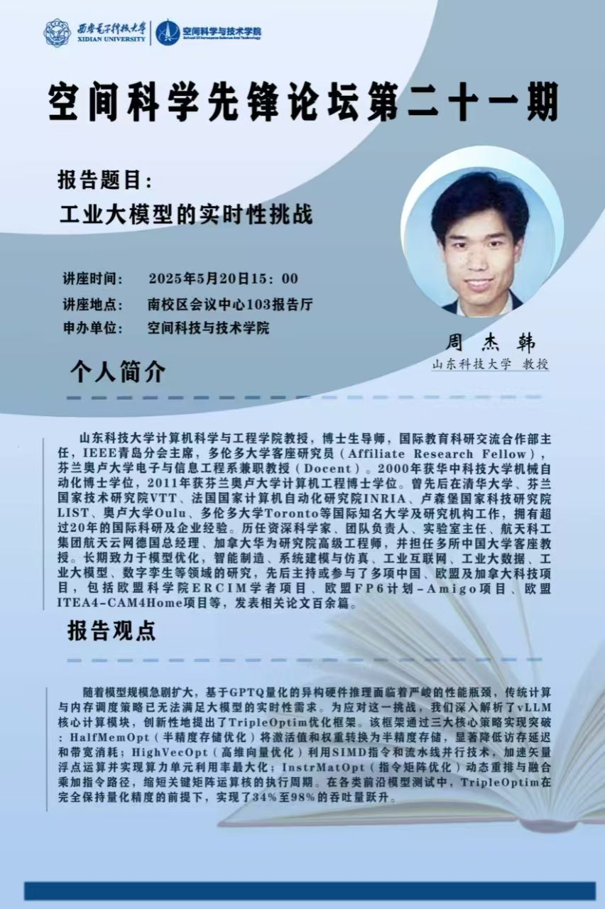 2025年5月21日上午10点,米兰·(milan)中国邀请山东科技大学周杰韩教授作了主题为《工业大模型的实时性挑战》的报告。会议在临潼校区图书馆一层报告厅举行,米兰·(milan)中国院长景军锋教授、副院长张蕾教授、米兰·(milan)中国青年教师、研究生两百余人参加了本次学术报告会,会议由张蕾副院长主持。