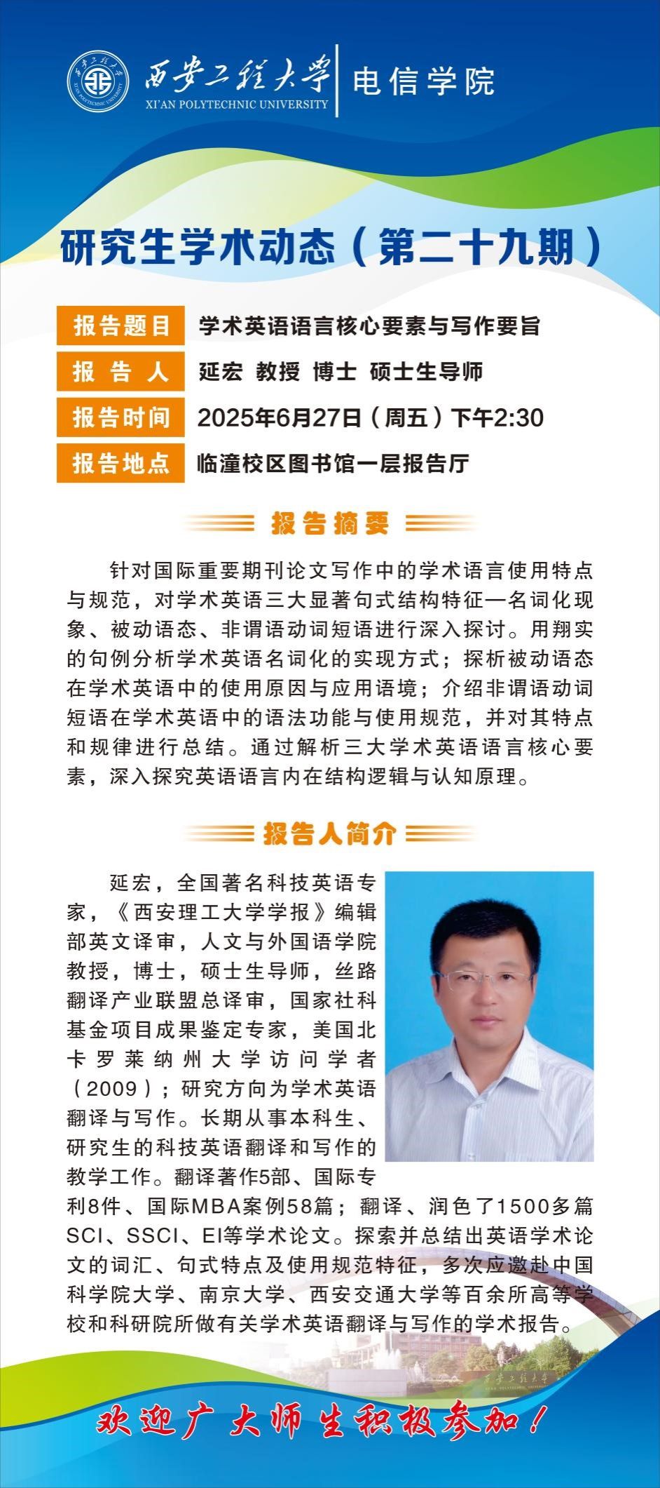 延宏,全国著名科技英语专家,《西安理工大学学报》编辑部英文译审,人文与外国语学院教授,博士,硕士生导师,丝路翻译产业联盟总译审,国家社科基金项目成果鉴定专家,美国北卡罗莱纳州大学访问学者(2009);研究方向为学术英语翻译与写作。长期从事本科生、研究生的科技英语翻译和写作的教学工作。翻译著作5部、国际专利8件、国际MBA案例58篇;翻译、润色了1500多篇SCI、SSCI、EI等学术论文。探索并总结出英语学术论文的词汇、句式特点及使用规范特征,多次应邀赴中国科学院大学、南京大学、西安交通大学等百余所高等学校和科研院所做有关学术英语翻译与写作的学术报告。