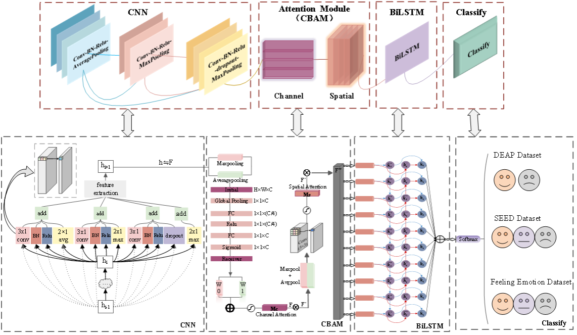 成果简介:基于脑电信号的情绪识别在情感计算、人机交互与智能医疗等领域具有重要应用价值。现有的深度学习模型常面临参数量大、计算复杂、调参困难等挑战。为此,本研究提出一种轻量级融合注意力机制的深度学习模型LC-CBAMB-Net。该模型以多频带微分熵作为特征输入,结合轻量化卷积神经网络提取空间特征,通过CBAM注意力机制动态增强通道与空间关键信息,并利用双向长短时记忆网络捕捉信号时序依赖关系,从而实现高效、精准的情绪状态分类。研究在DEAP、SEED和Feeling Emotion三个公共数据集上进行测试,模型在效价-唤醒度二分类及三分类任务中均取得优异性能,显著优于现有多种方法。该研究不仅为脑电情绪识别提供了一种高精度、轻量化的解决方案,也为基于注意力和时序建模的多模态信号处理提供了新思路。(撰写:纪超,审核:张蕾)